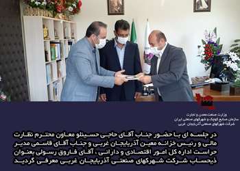 در جلسه ای با حضور جناب آقای حاجی حسینلو معاون محترم نظارت مالی و رئیس خزانه معین آذربایجان غربی و جناب آقای قاسمی مدیر حراست اداره کل امور اقتصادی و دارائی آذربایجان غربی صورت پذیرفت آقای فاروق رسولی بعنوان ذیحساب شرکت شهرکهای صنعتی آذربایجان غربی معرفی گردید.